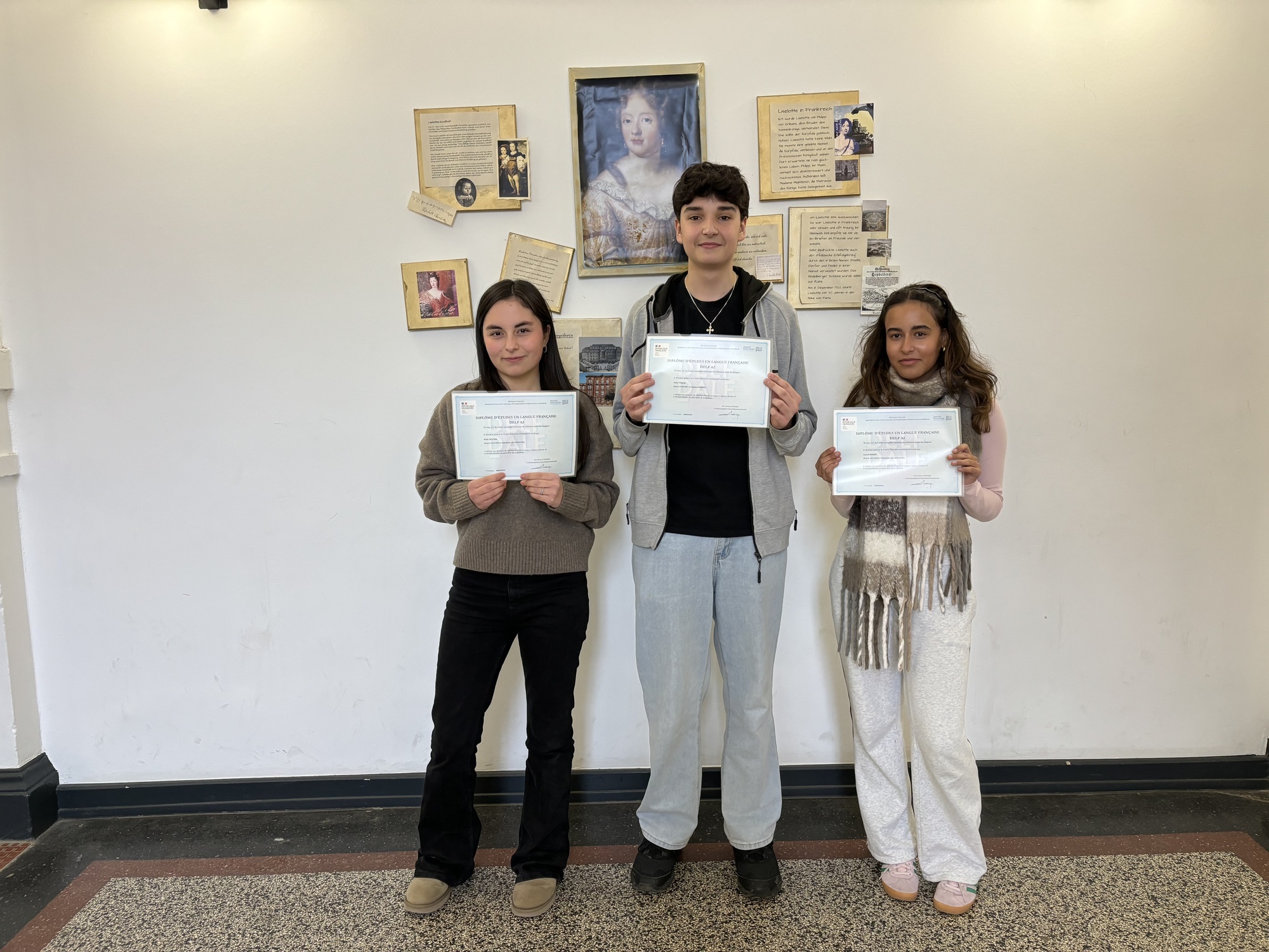 Drei Schülerinnen und ein Schüler durften sich diese Woche über ihr DELF-Diplom freuen. Dafür haben sie sich im Rahmen der DELF A2-AG mit Frau Rudolph vorbereitet. Das französische Sprachzertifikat wurde nach erfolgreicher schriftlicher und mündlicher Prüfung vom Ministère de l'Éducation nationale ausgestellt und am 19. November von Schulleiter Dr. Vogel überreicht. Félicitations!Neue Unterstützung aus dem Erlös des Weihnachtsmarktes 2025