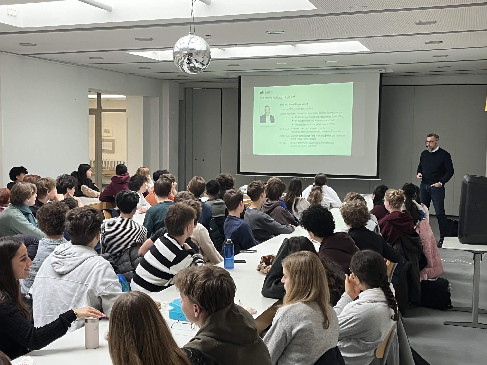 Am 5. Februar 2026 fand am Liselotte-Gymnasium Mannheim eine Informationsveranstaltung für die Kursstufe 1 zur Dualen Hochschule Baden-Württemberg (DHBW) statt. Als Referent war Herr Professor Klaus-Jürgen Jeske zu Gast, der dem Lilo seit vielen Jahren als verlässlicher Kooperationspartner verbunden ist.In seinem Vortrag stellte Herr Professor Jeske die besonderen Studienbedingungen des dualen Studiums vor und gab einen anschaulichen Überblick über den DHBW-Standort Mannheim. Ein besonderer Schwerpunkt lag dabei auf den Studiengängen im Bereich der Versicherungs- und Finanzwirtschaft. Die Schülerinnen und Schüler erhielten wertvolle Einblicke in den Wechsel zwischen Theorie- und Praxisphasen, die enge Verzahnung mit Partnerunternehmen sowie die beruflichen Perspektiven nach dem Studium.