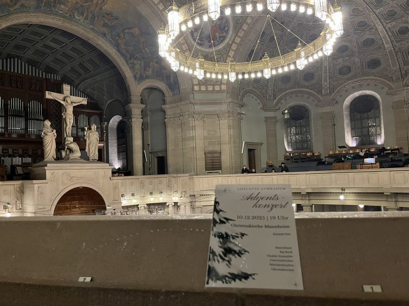 Im Adventskonzert des Liselotte-Gymnasiums in der Christuskirche erklang adventliche und weihnachtliche Musik dargeboten von der Bläserklasse 6b, dem Ukulele-Ensemble, den "Jungs", den Unter-, Mittel- und Oberstufen Chören und der BigBand. Begeistert lauschten die Besucher in der vollen Kirche den Klängen der mit viel Freude musizierenden Schülerinnen und Schülern mit ihren Musiklehrerinnen Frau Kilian, Frau Egli und Frau Kröper und Musiklehrer Herr Bosse.