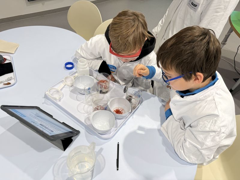 Im Kidslab der BASF experimentierten die Klasse aufgeteilt in drei Gruppen unter Anleitung rund um das Thema Nachhaltigkeit. Im Anschluss stellten sich die Gruppen ihre Ergebnisse kurz vor.
