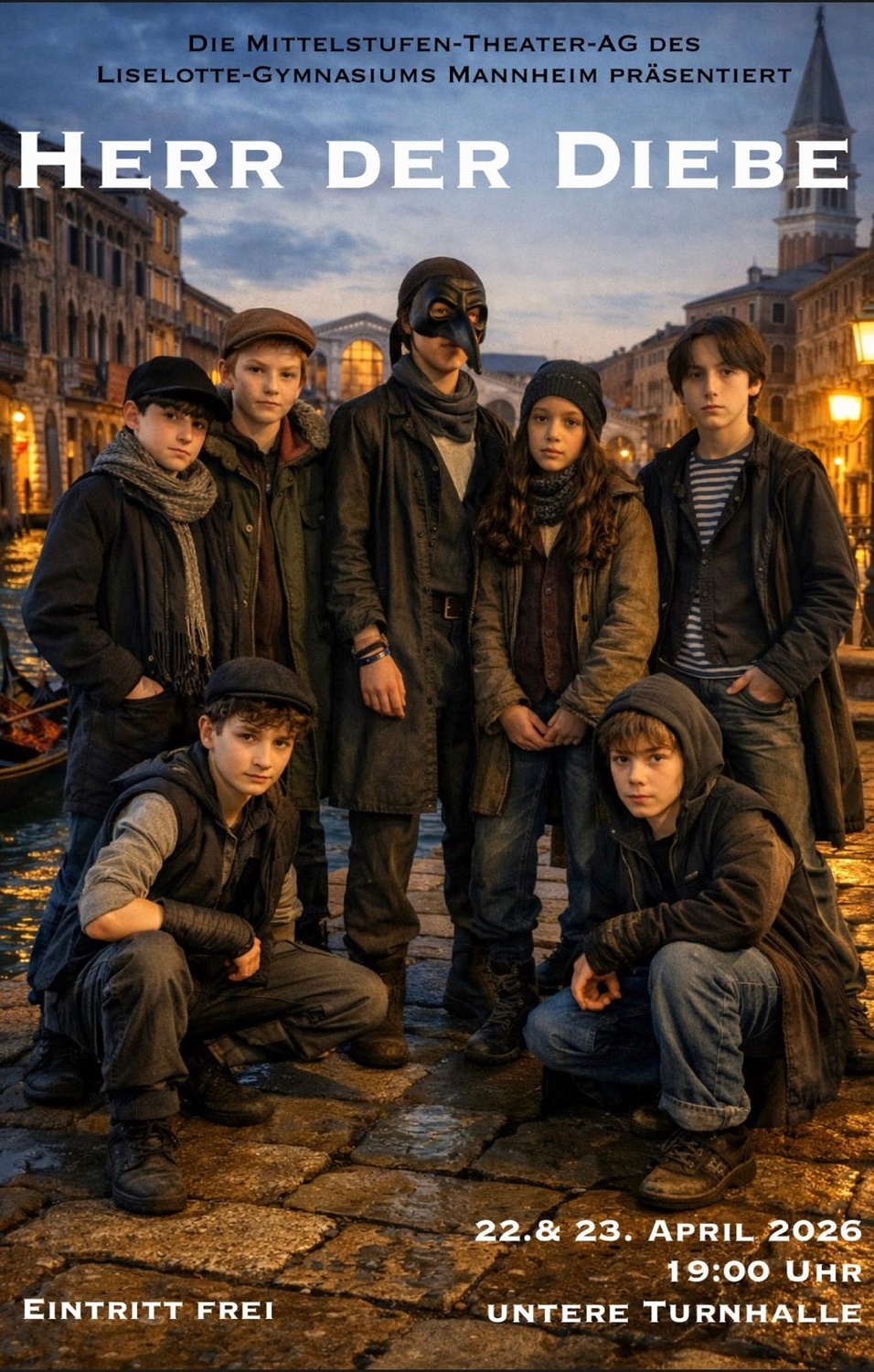 Die Mittelstufen-Theater-AG präsentiert „Herr der Diebe“ nach dem Roman von Cornelia Funke. Im Mittelpunkt stehen die Brüder Prosper und Bo, die nach dem Tod ihrer Mutter nach Venedig fliehen, um nicht getrennt zu werden. Dort schließen sie sich einer Kinderbande um den geheimnisvollen „Herrn der Diebe“ an. Zwischen Abenteuern, Verfolgung und einem magischen Karussell geht es um Freundschaft, Vertrauen und den Wunsch, sein eigenes Leben zu bestimmen. Insgesamt 23 Schülerinnen und Schüler wirken an der Inszenierung mit. Die Aufführungen finden am 22. und 23. April jeweils um 19:00 Uhr in der unteren Turnhalle statt.