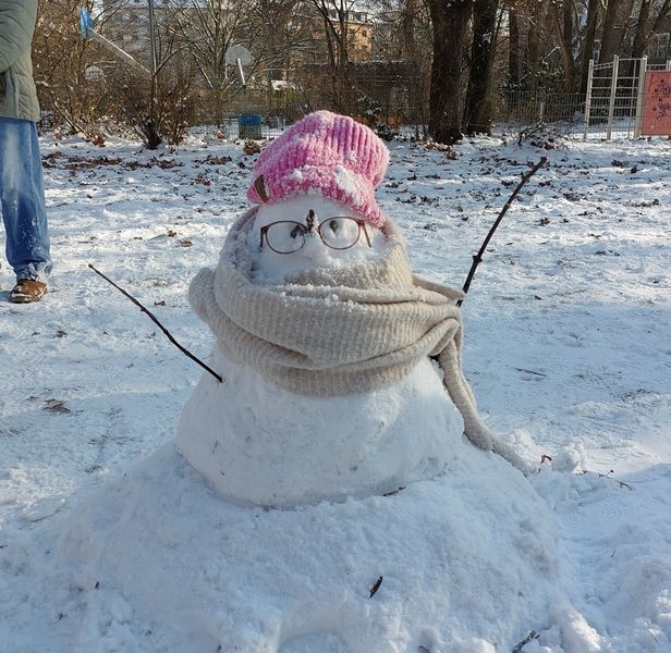 Die Schülerinnen und Schüler der Klasse 5c bauten am ersten Schultag nach den Ferien, 7. Januar, in der Klassenlehrerstunde diesen netten Schneemann und eine ebenso nette Schneefrau.