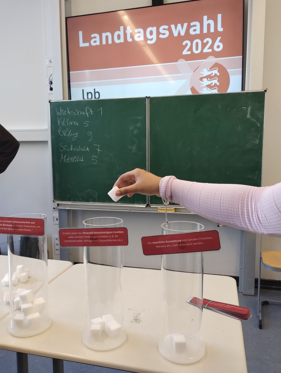 Sich zur Bürgermeisterin wählen lassen und die Gemeinderatsstitzung leiten, als Stadtkämmerer über die Finanzen einer Gemeinde Bescheid wissen und als Fraktionsmitglied die eigene Position vertreten - in all diese Rollen schlüpften am 30. Januar 2024 die Schülerinnen und Schüler der Klassen 8b und c, die als Einstieg in die Gemeinschaftskunde-Einheit zum Thema "Gemeindepolitik" einen politischen Tag mit Mitarbeiterinnen der Landeszentrale für Politische Bildung erleben durften.Dabei galt es, in einem Planspiel über die Umsetzung eines Skateparks in der fiktiven Kleinstadt Neckardorf zu beraten und abzustimmen. Die Klassen waren engagiert bei der Sache, sodass der Skatepark in beiden Gruppen nach hitziger Diskussion und konstruktiver inhaltlicher Beratung abgestimmt wurde. (M. Jellinek)
