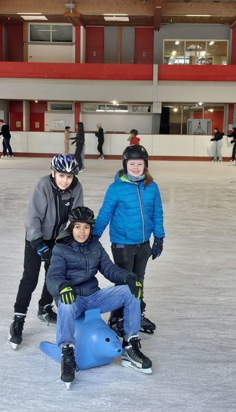 Damit man kurz vor Weihnachten wenigstens ein wenig Eis sieht, wenn's sonst schon so warm ist und keiner auf weiße Weihnacht hoffen kann, hat sich die 5b gedacht: Ab in die Eissporthalle Herzogenried am 19. Dezember. Mit ihren Klassenpaten aus der 10. Klasse Zoé Diederich, Mia Kupper und Lasse Schams und den Klassenlehrern Frau Strohmann und Herrn Andreas hatte die Bläserklasse viel rutschigen Spaß.Eisiger Spaß beim Schlittschuhlaufen der Klasse 5a